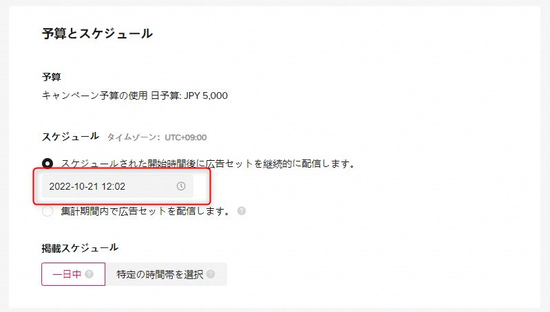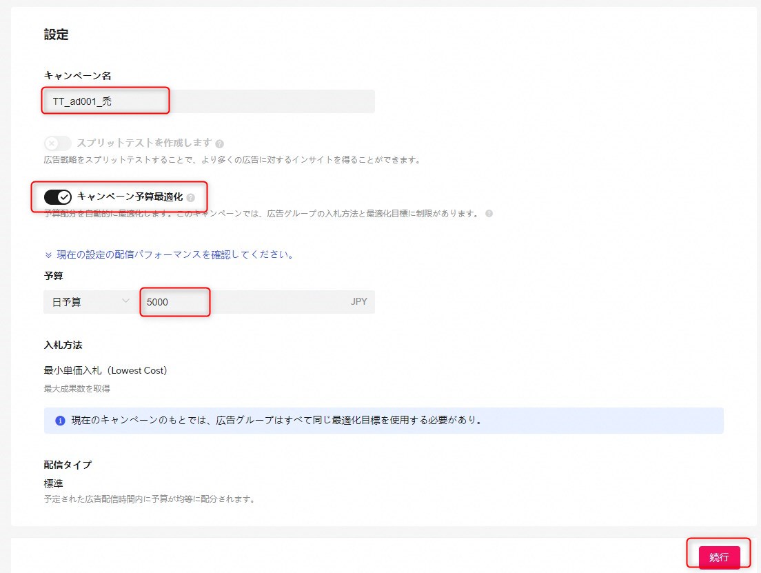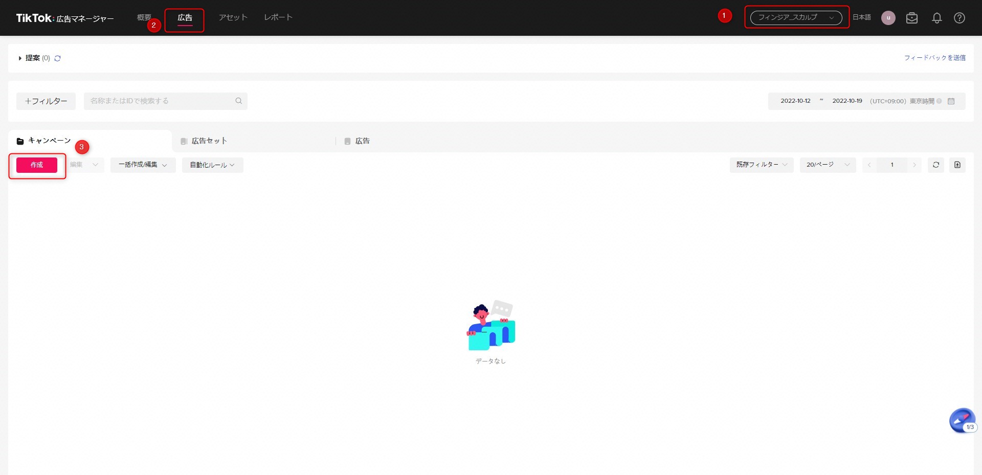 ①広告主アカウントの確認後、キャンペーンの作成ボタンを押下します。