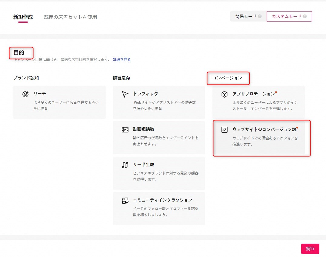 コンバージョンのウェブサイトのコンバージョン数を選択します。