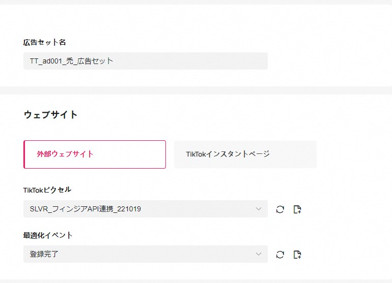 TikTokピクセルは、API連携時に作成したピクセルを選択。