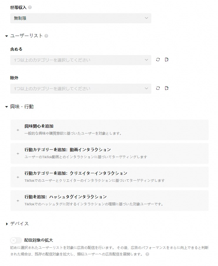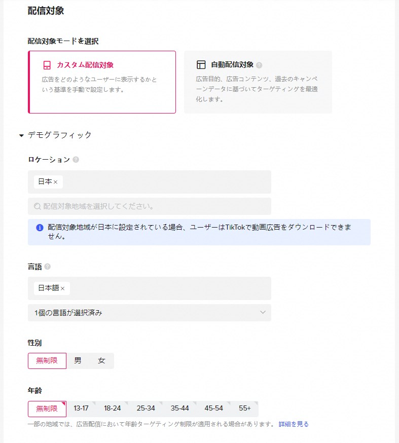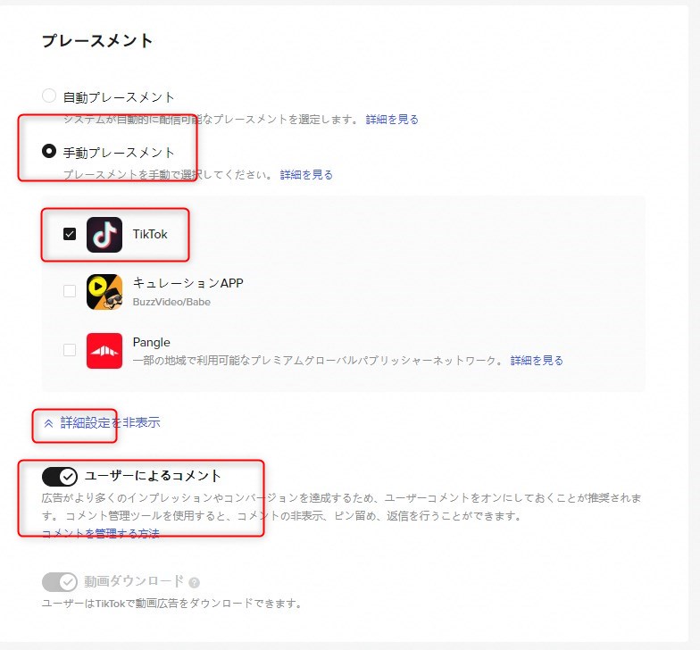 手動プレースメントを選択し、TikTokのみにチェックをつける。